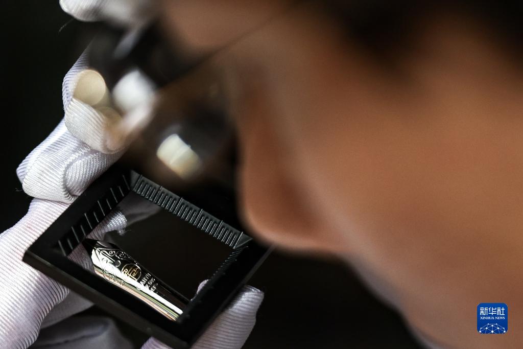 7月1日,袁建在位于貴州大學(xué)國家大學(xué)科技園的工作室用放大鏡查看鋼筆的筆尖成品。