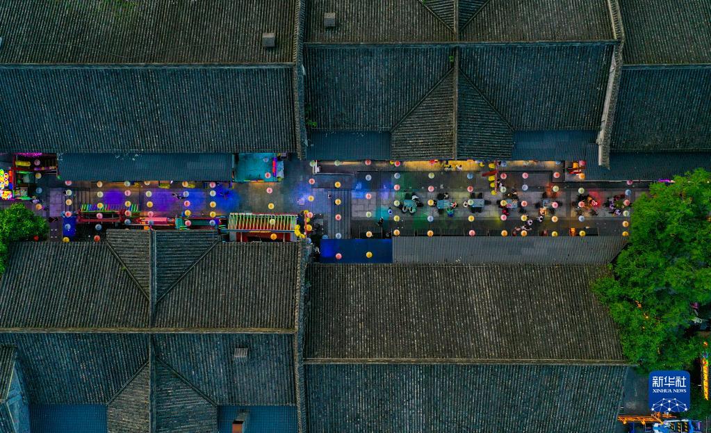 游客在重慶陶然居大觀(guān)園新國潮坊游覽、體驗(6月1日攝,無(wú)人機照片)。