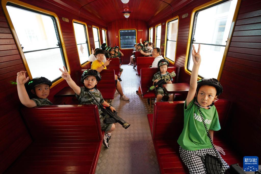 7月7日,在由老廠(chǎng)區廢舊鐵路改造成的工業(yè)旅游觀(guān)光線(xiàn)路上,參加拓展訓練營(yíng)活動(dòng)的孩子們乘坐小火車(chē)觀(guān)光。新華社記者 王建威 攝