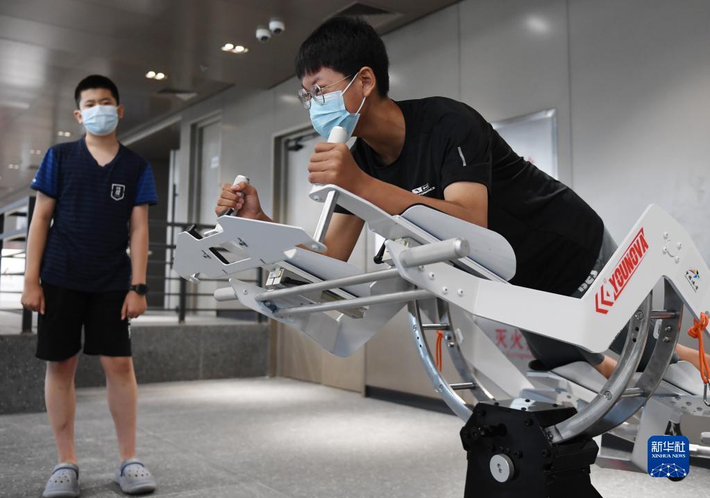 7月16日,一名少年體驗展出的冰雪運動(dòng)訓練設施。