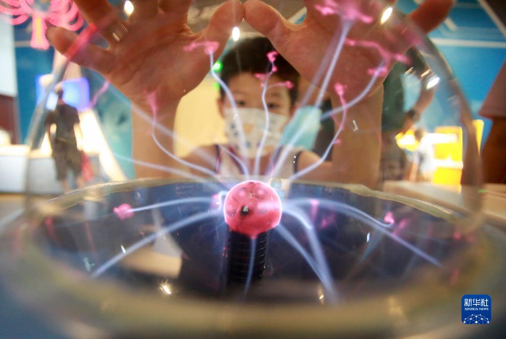 7月17日,小朋友在江蘇揚州科技館內體驗“輝光球”。
