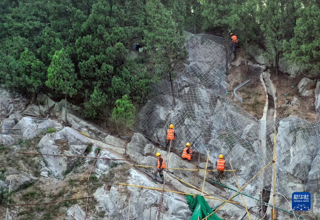工作人員在洛陽(yáng)龍門(mén)石窟奉先寺安裝防護網(wǎng)(4月13日攝,無(wú)人機照片)。 新華社記者 李安 攝
