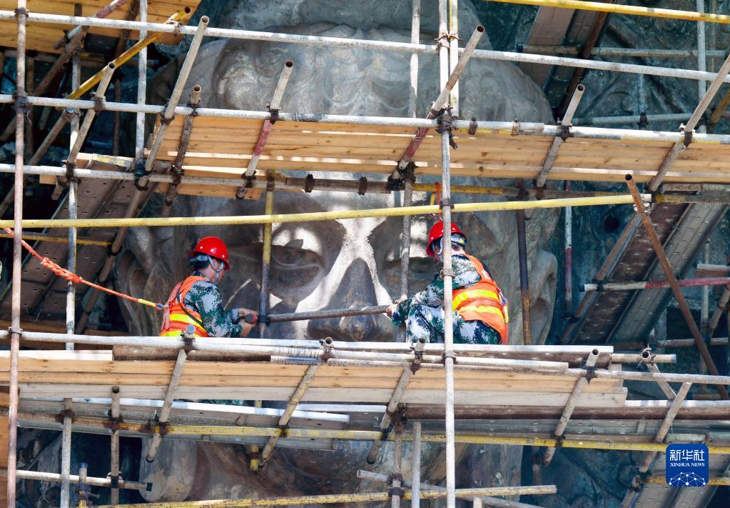 工作人員在洛陽(yáng)龍門(mén)石窟奉先寺拆除腳手架(7月21日攝)。 新華社發(fā)(張怡熙 攝)