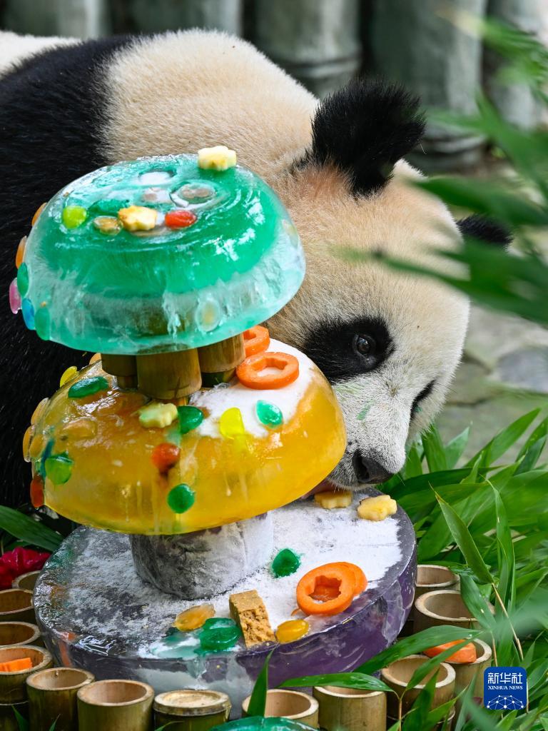8月3日,在中國大熊貓保護研究中心雅安基地,大熊貓“安安”在享用美食。
