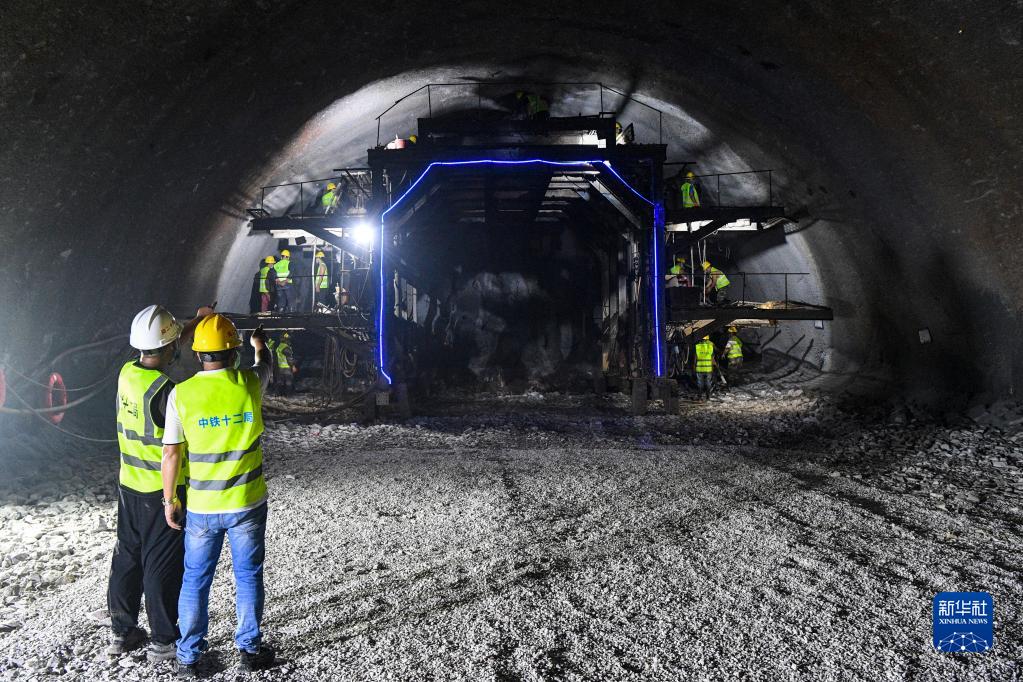 8月3日,在位于廣西環(huán)江毛南族自治縣的貴南高鐵大方山隧道內,工人在掌子面施工作業(yè)。