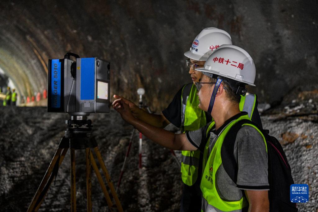 8月3日,在位于廣西環(huán)江毛南族自治縣的貴南高鐵大方山隧道內,技術(shù)人員在爆破前對隧道內的巖層進(jìn)行掃描。