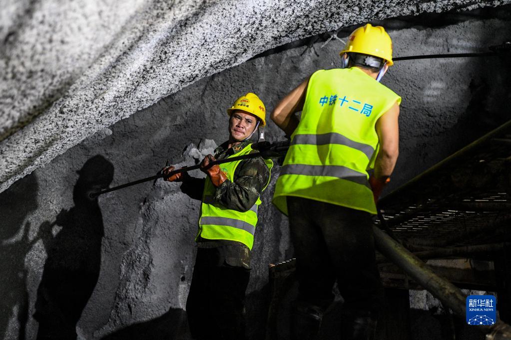 8月3日,在位于廣西環(huán)江毛南族自治縣的貴南高鐵大方山隧道內,工人用風(fēng)槍打爆破眼。