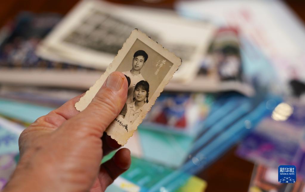 8月2日,許再霞在家中展示自己和丈夫1968年在學(xué)校的合影。