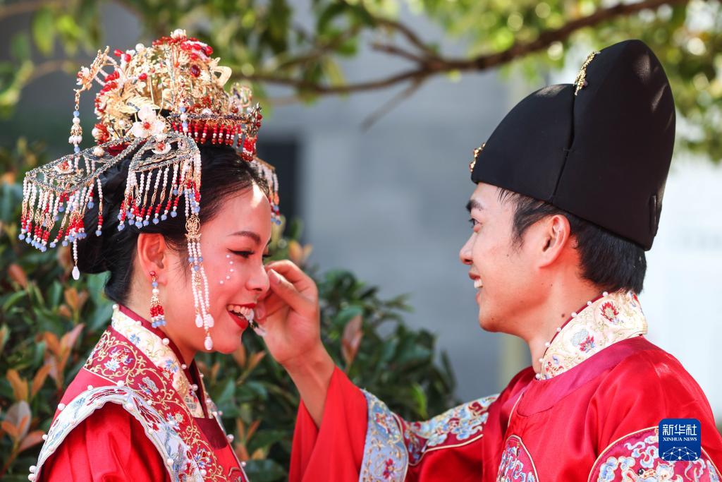 當日是七夕,2022(壬寅)年貴陽(yáng)孔學(xué)堂中華婚禮在貴陽(yáng)孔學(xué)堂舉辦,12對新人身穿中式婚服通過(guò)合巹禮、解纓結發(fā)、共書(shū)婚帖等方式完成傳統婚禮儀式。
