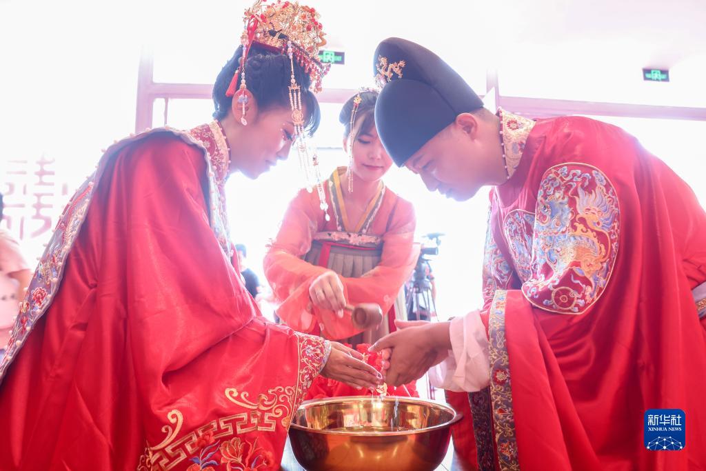 當日是七夕,2022(壬寅)年貴陽(yáng)孔學(xué)堂中華婚禮在貴陽(yáng)孔學(xué)堂舉辦,12對新人身穿中式婚服通過(guò)合巹禮、解纓結發(fā)、共書(shū)婚帖等方式完成傳統婚禮儀式。