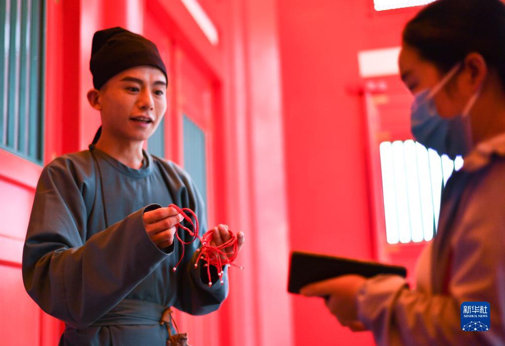 8月4日,演員(左)在“長(cháng)安十二時(shí)辰”主題街區向游客發(fā)紅繩。