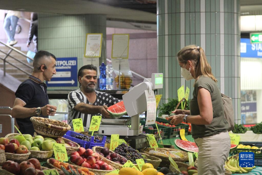 8月2日,顧客在德國法蘭克福一家攤位前購買(mǎi)水果。