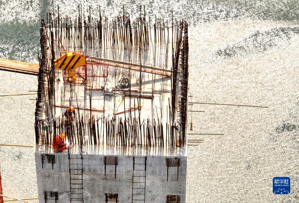 8月3日傍晚,融安至從江高速公路一期工程融水段,工人在橋墩上施工(無(wú)人機照片)。