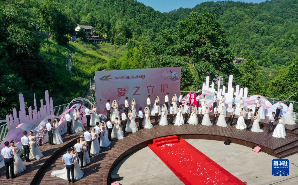 8月4日,新人在重慶萬(wàn)州三峽恒合旅游度假區參加集體婚禮(無(wú)人機照片)。
