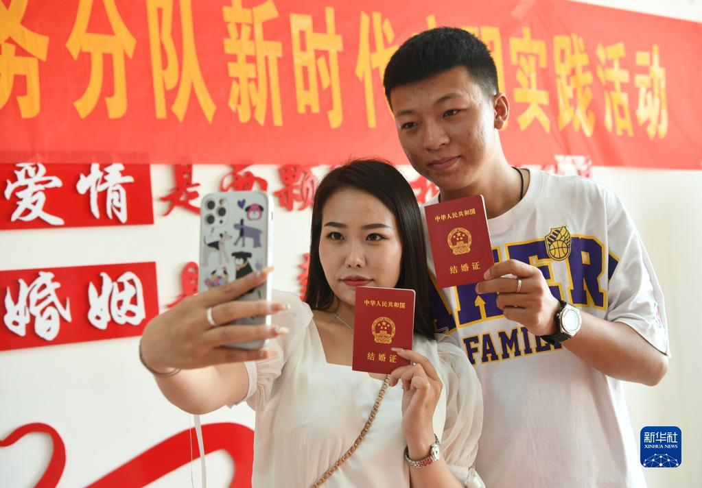 8月4日,在河北省石家莊市欒城區民政局婚姻登記處,一對新人領(lǐng)取結婚證后拍照留念。