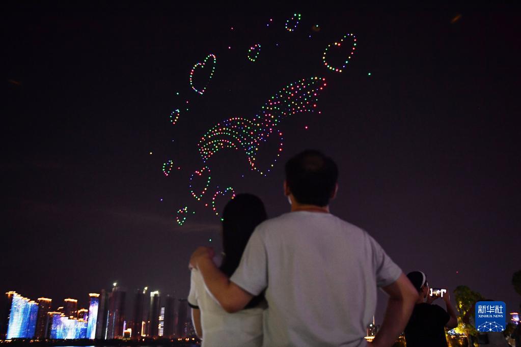 當日是七夕節,一場(chǎng)無(wú)人機光影秀在湖南省長(cháng)沙市湘江畔上演,吸引市民駐足觀(guān)看。