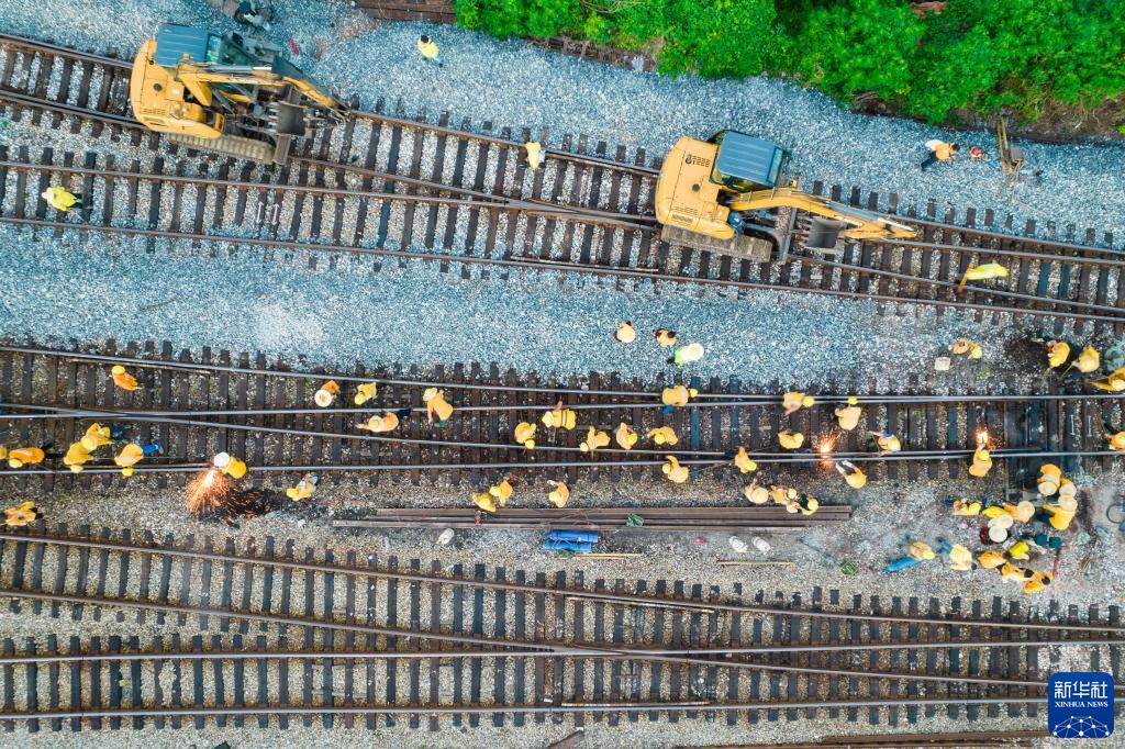 8月5日,在株洲北站編組場(chǎng),鐵路工人們正在換岔施工(無(wú)人機照片)。