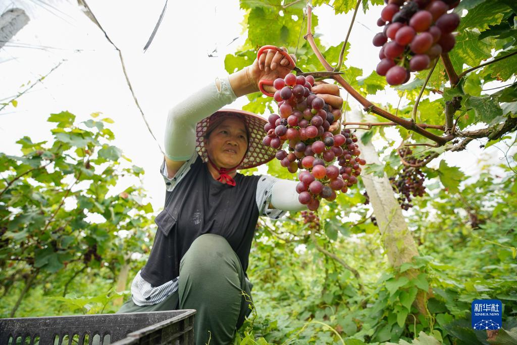 8月5日,村民在貴州省黔東南苗族侗族自治州丹寨縣龍泉鎮馬鞍村葡萄園采摘葡萄。