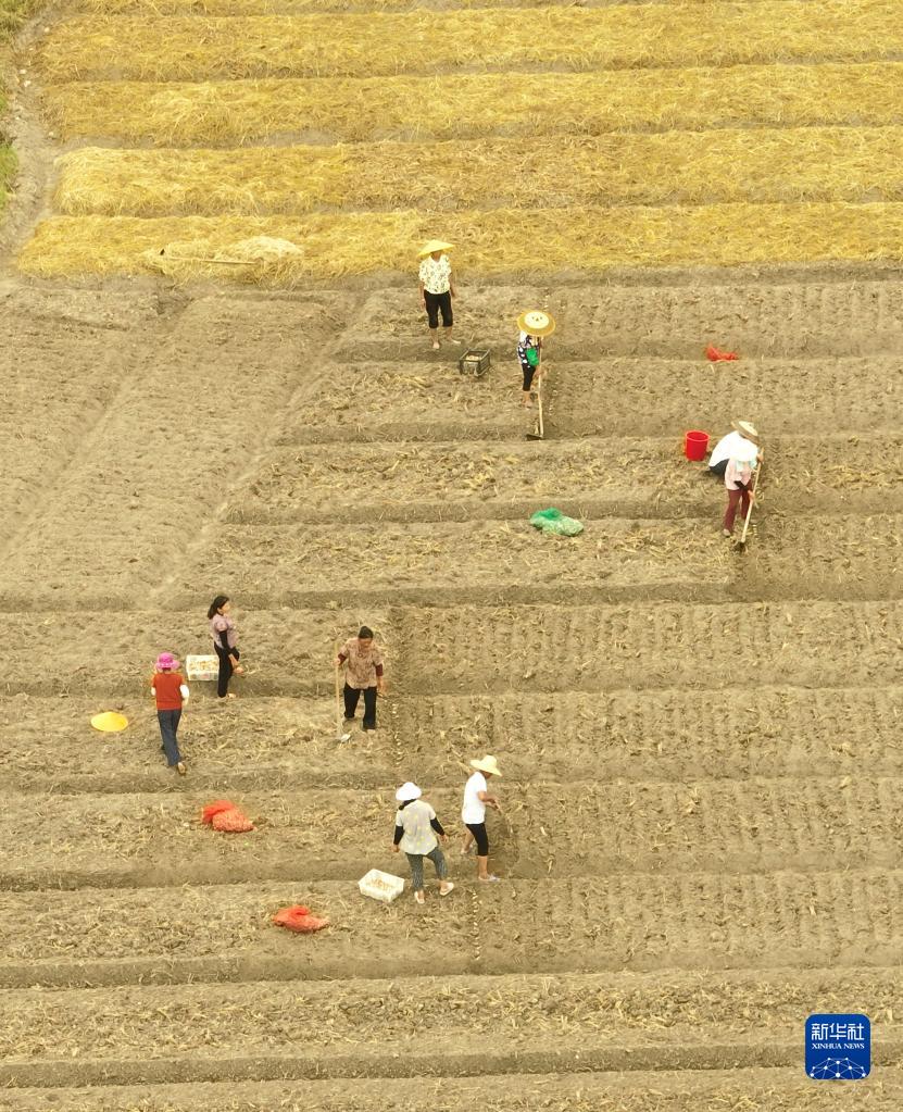 8月5日,在湖南省永州市道縣營(yíng)江街道陽(yáng)樂(lè )田社區,農民在種植藠頭(無(wú)人機照片)。