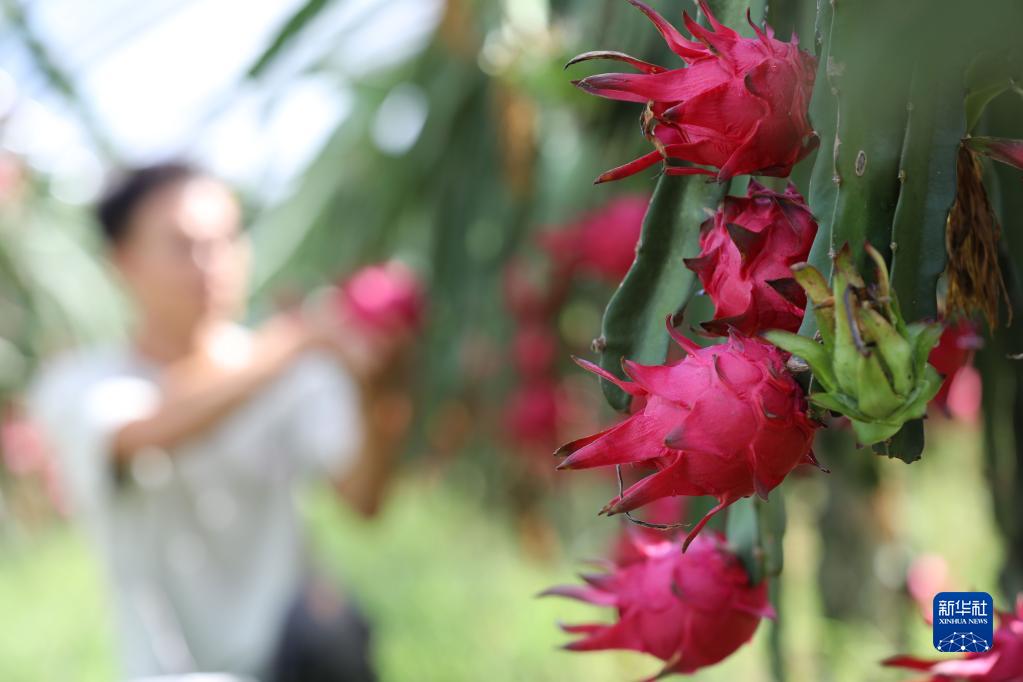8月5日,在湖南省永州市道縣梅花鎮棠下村,果農在采摘火龍果。