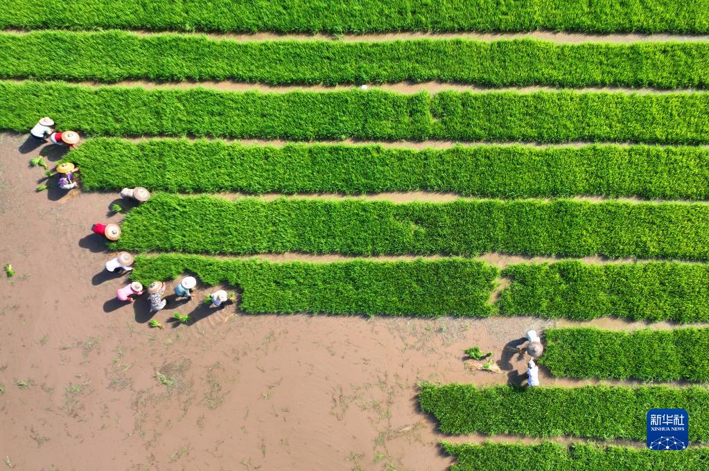 8月5日,在湖南省衡陽(yáng)市祁東縣歸陽(yáng)鎮,當地村民在起秧苗(無(wú)人機照片)。