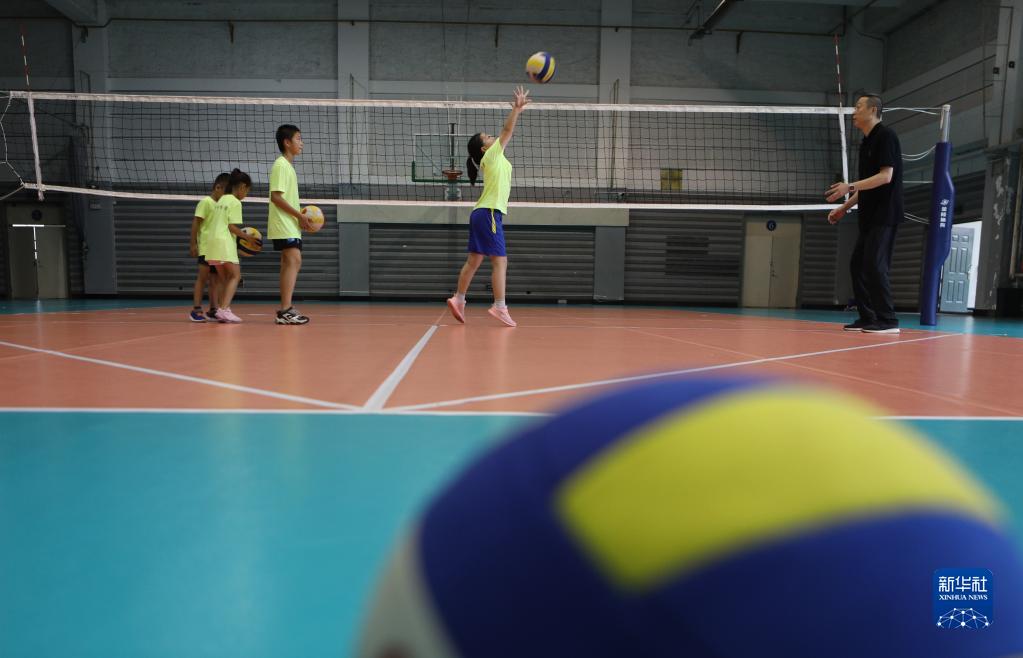 8月5日,在遼寧省沈陽(yáng)市沈陽(yáng)體育學(xué)院開(kāi)展的暑期夏令營(yíng),小朋友們在練習排球。