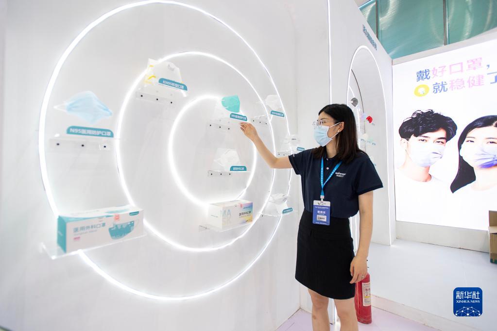 8月5日,在2022年世界大健康博覽會(huì )穩健醫療展廳,工作人員向觀(guān)眾展示口罩產(chǎn)品。