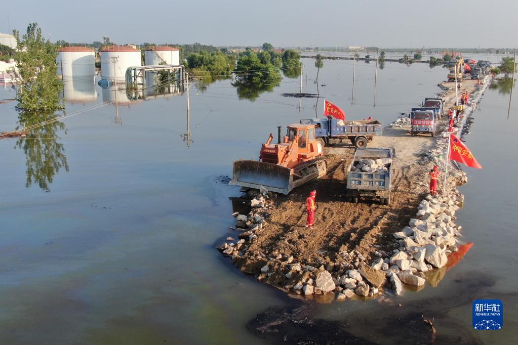8月5日,搶險人員在潰口處進(jìn)行封堵作業(yè)(無(wú)人機照片)。