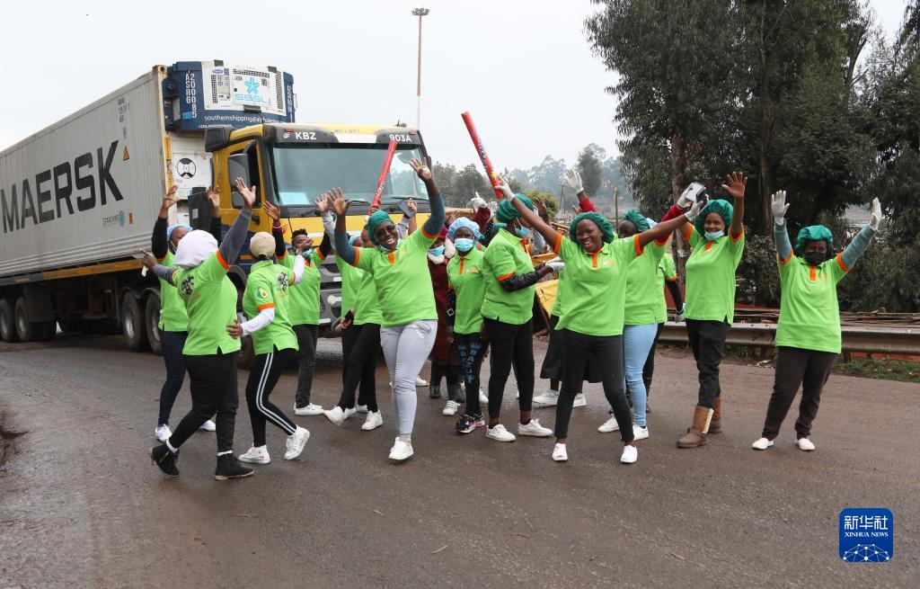 8月2日,在位于肯尼亞利穆魯鎮的桑瑞普工廠(chǎng),員工慶??夏醽喪着匠隹谥袊孽r食牛油果集裝箱發(fā)車(chē)。