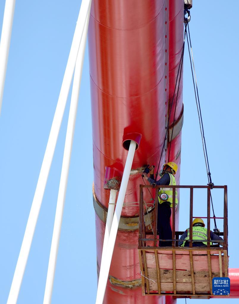8月6日,施工人員在中鐵十一局池黃鐵路墩上特大橋系桿拱施工現場(chǎng)作業(yè)。