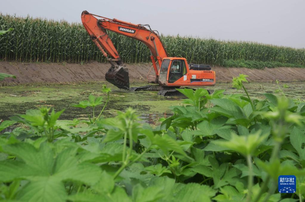8月6日,工人在昌黎縣新集鎮境內的引灤河水灌渠清淤現場(chǎng)施工。