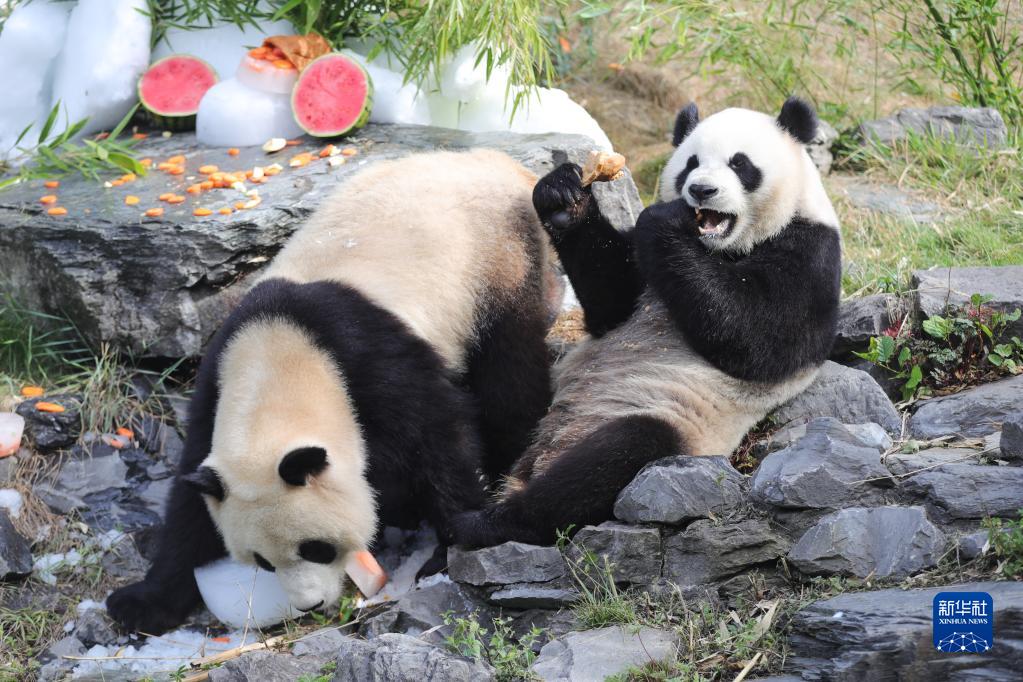 8月6日,在比利時(shí)布呂熱萊特的天堂動(dòng)物園,大熊貓“寶弟”(左)、“寶妹”享用“生日大餐”。
