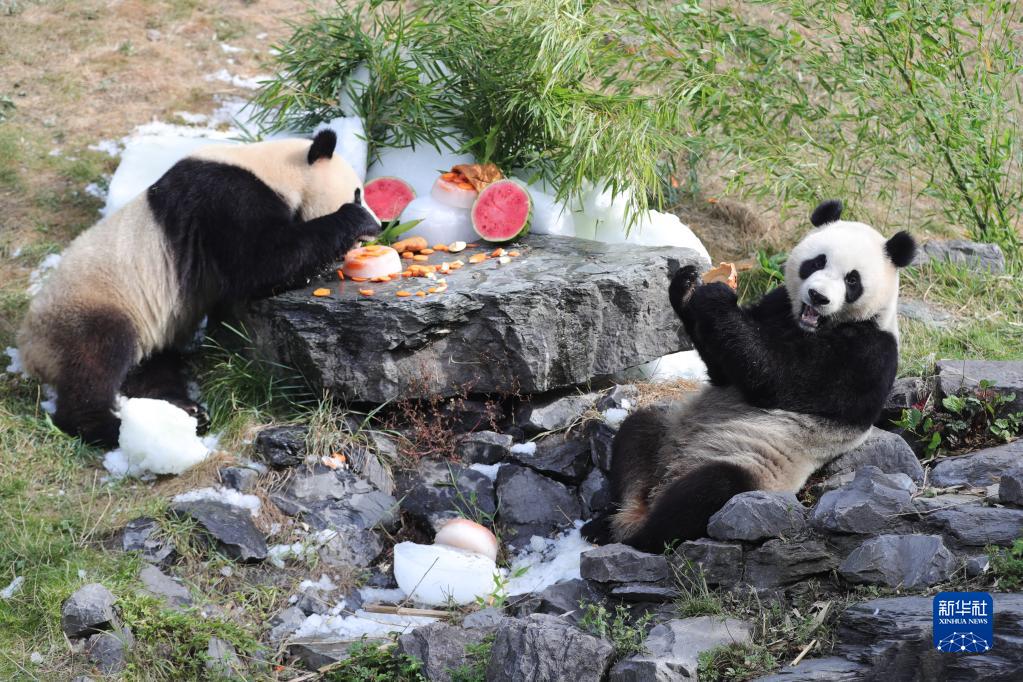 8月6日,在比利時(shí)布呂熱萊特的天堂動(dòng)物園,大熊貓“寶弟”(左)、“寶妹”享用“生日大餐”。