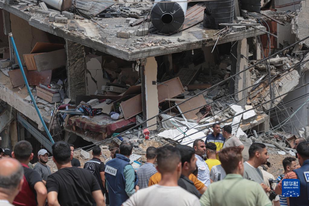 8月6日,加沙城遭遇空襲后,人們查看損毀的樓房。