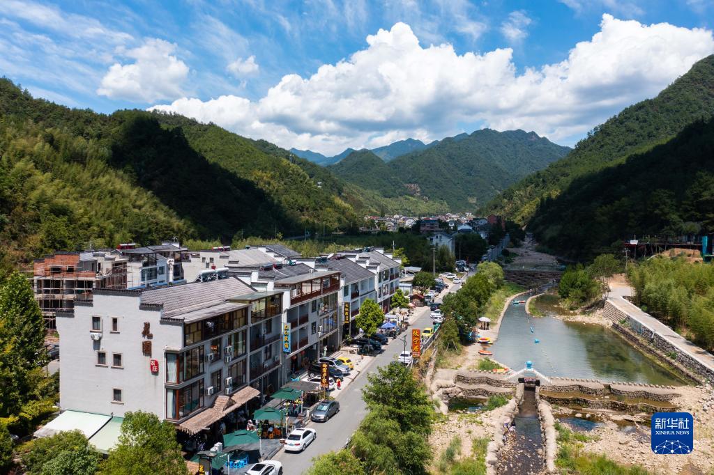 位于杭州市臨安區龍崗鎮龍井村漂流項目邊上的民宿集群(8月7日攝,無(wú)人機照片)。