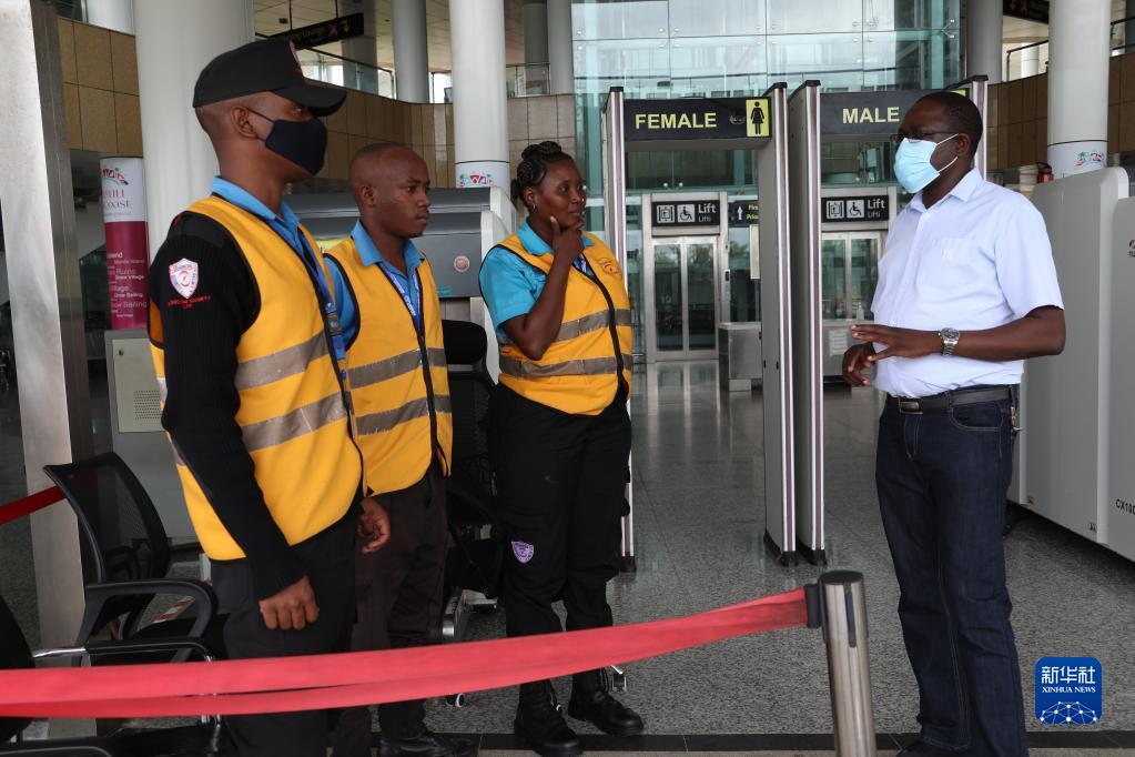 7月27日,肯尼亞蒙內鐵路蒙巴薩終點(diǎn)站站長(cháng)科斯馬斯(右)在站內與安檢員交談。