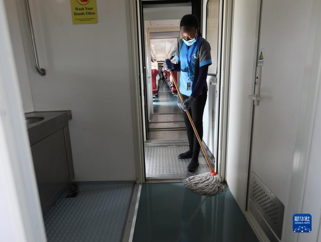7月29日,清潔工莫希在肯尼亞蒙內鐵路客運列車(chē)上打掃衛生。
