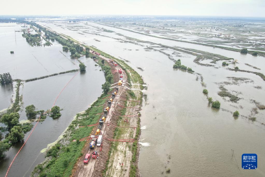 8月7日,搶險人員在遼寧盤(pán)錦繞陽(yáng)河左岸曾經(jīng)的河堤潰口北段進(jìn)行排澇作業(yè)(無(wú)人機照片)。