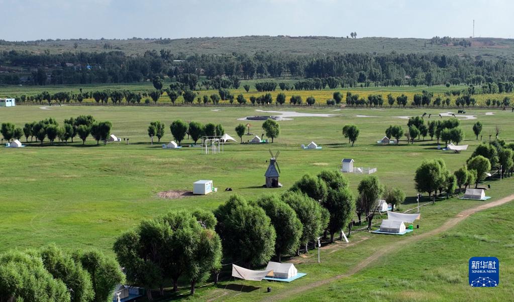 游人在神木市爾林兔大草原露營(yíng)(8月5日攝,無(wú)人機照片)。爾林兔鎮對荒蕪的沙地進(jìn)行保護性開(kāi)發(fā),建成萬(wàn)畝大草原,成了美麗的旅游休閑之地。