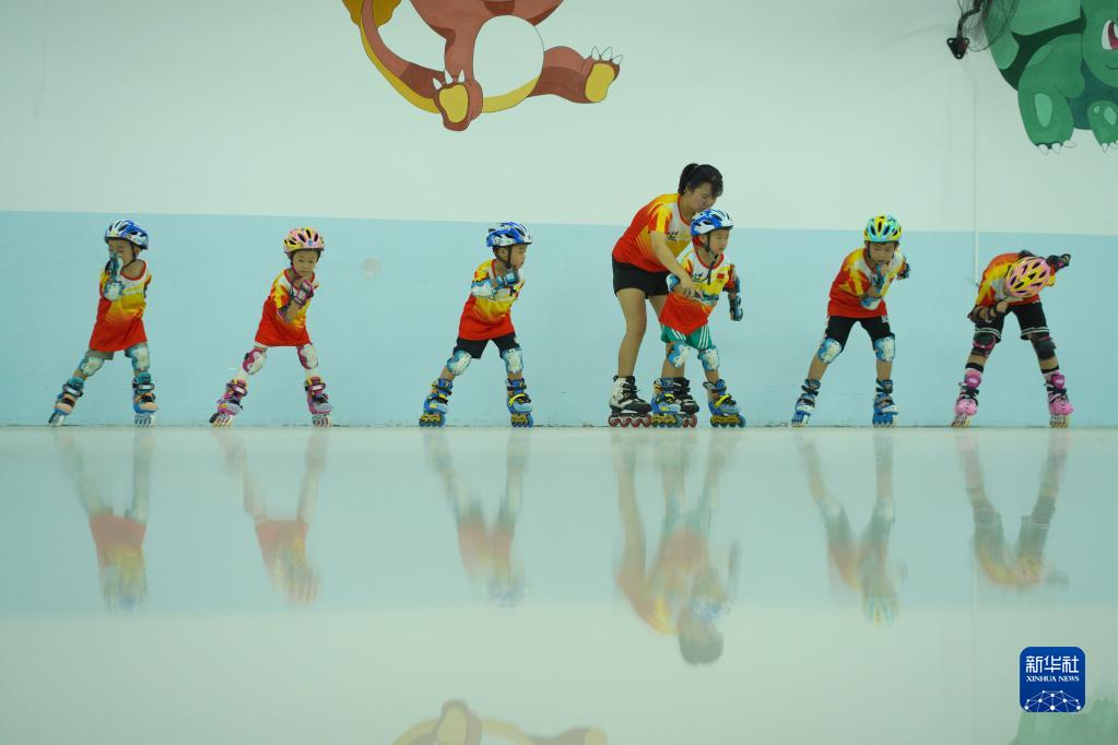8月8日,小朋友在河北省邢臺市內丘縣一家輪滑俱樂(lè )部參加輪滑訓練。