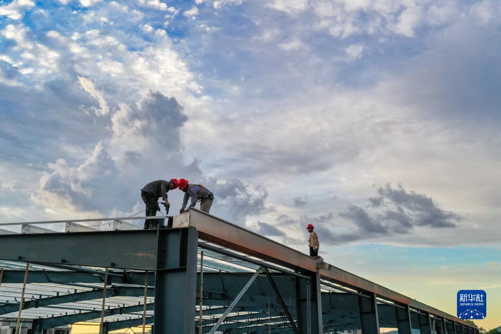 8月7日傍晚,在永州市藍山縣經(jīng)開(kāi)區創(chuàng )品國際智慧物流園項目建設現場(chǎng),工人在施工(無(wú)人機照片)。