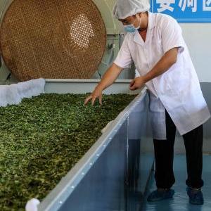 8月9日,工作人員在石阡縣楓香鄉梨子園村茶葉加工廠(chǎng)內檢查茶青。