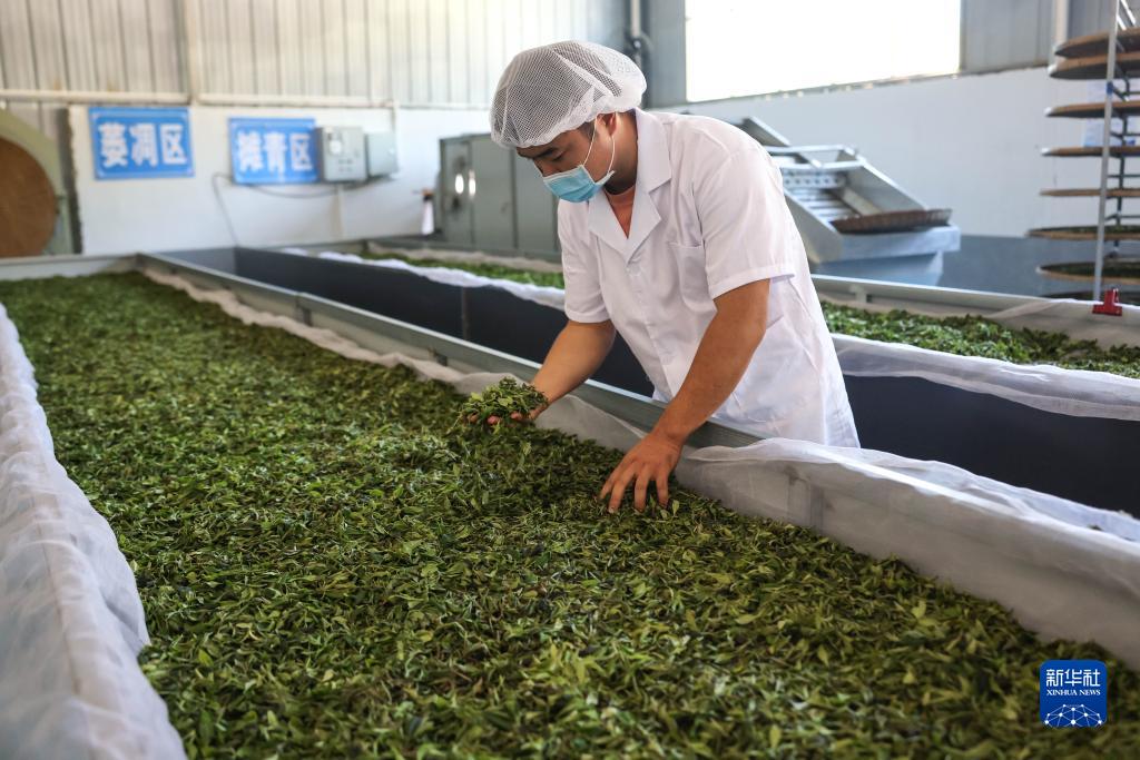 8月9日,工作人員在石阡縣楓香鄉梨子園村茶葉加工廠(chǎng)內對茶葉進(jìn)行萎凋。