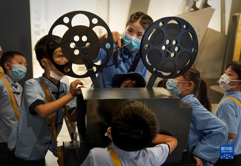 研學(xué)班的老師在電影小鎮里為孩子們講解老式電影放映機(8月6日攝)。