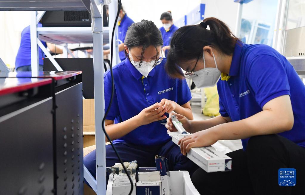 8月9日,江蘇省核酸檢測隊工作人員在實(shí)驗室投入使用前做準備工作。