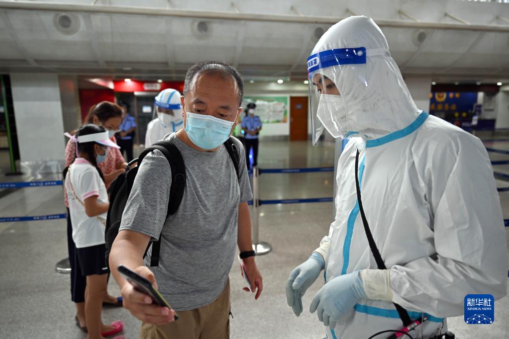 8月9日,三亞鳳凰國際機場(chǎng)工作人員在查驗游客的核酸檢測陰性證明。