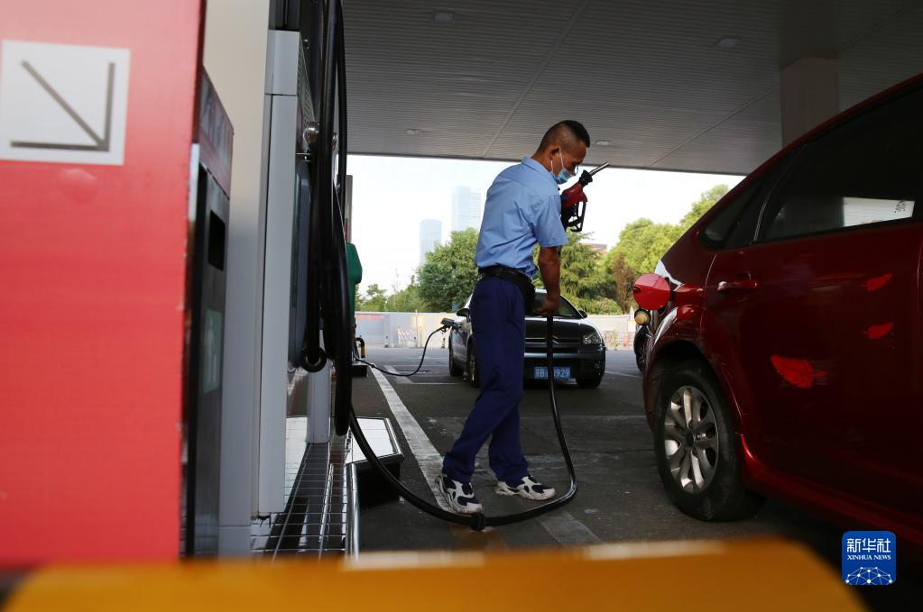 8月9日,江蘇無(wú)錫一加油站工作人員給汽車(chē)加油。