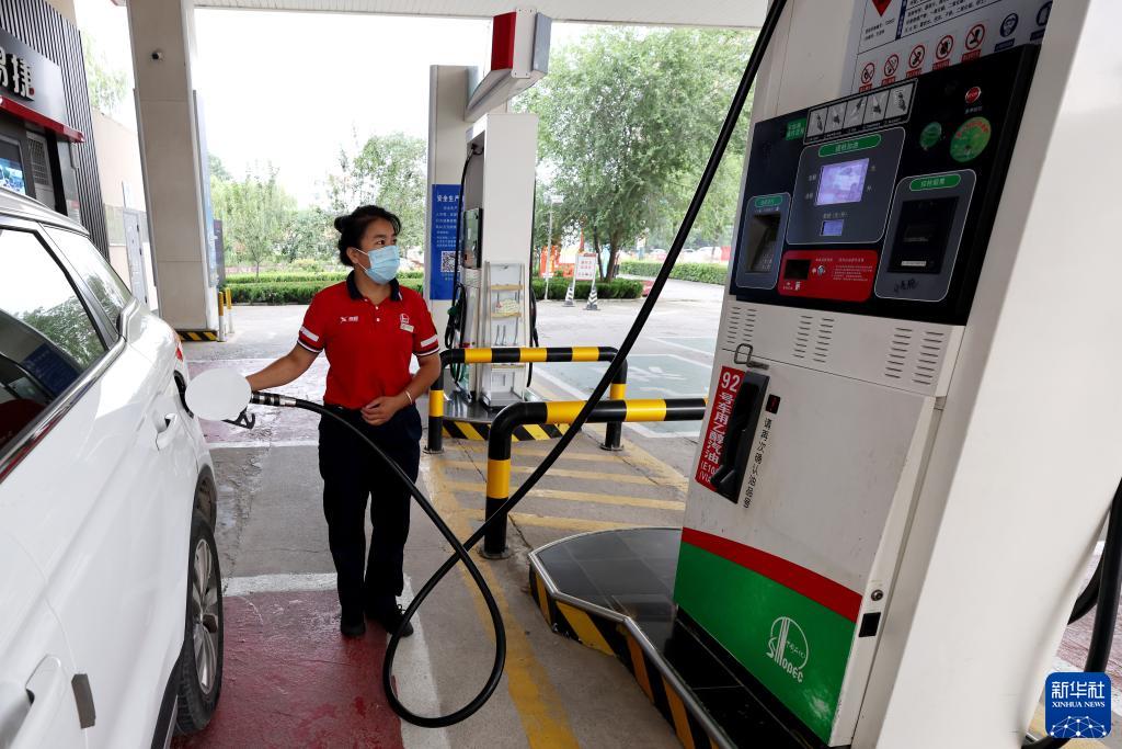 8月9日,山東省棗莊市光明路街道一加油站的工作人員為汽車(chē)加油。