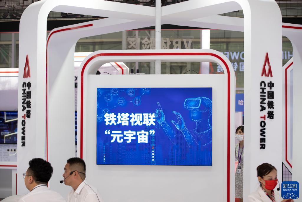 8月9日,在中國鐵塔股份有限公司展區,工作人員在布展。