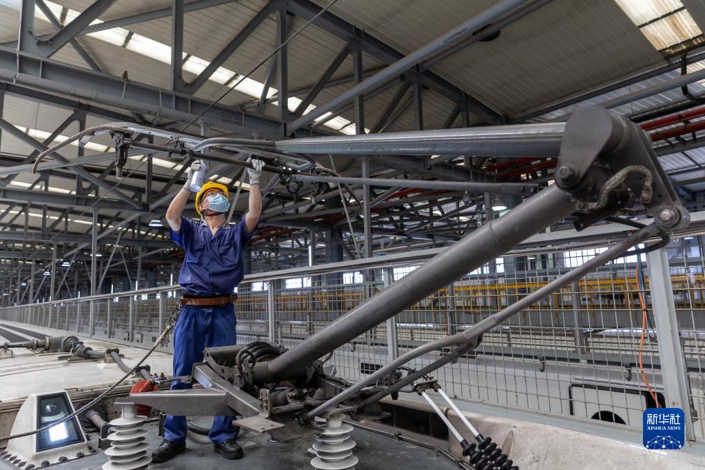 8月10日,動(dòng)車(chē)組機械師袁洋對受電弓碳滑板進(jìn)行漏風(fēng)試驗。 新華社記者 王翔 攝